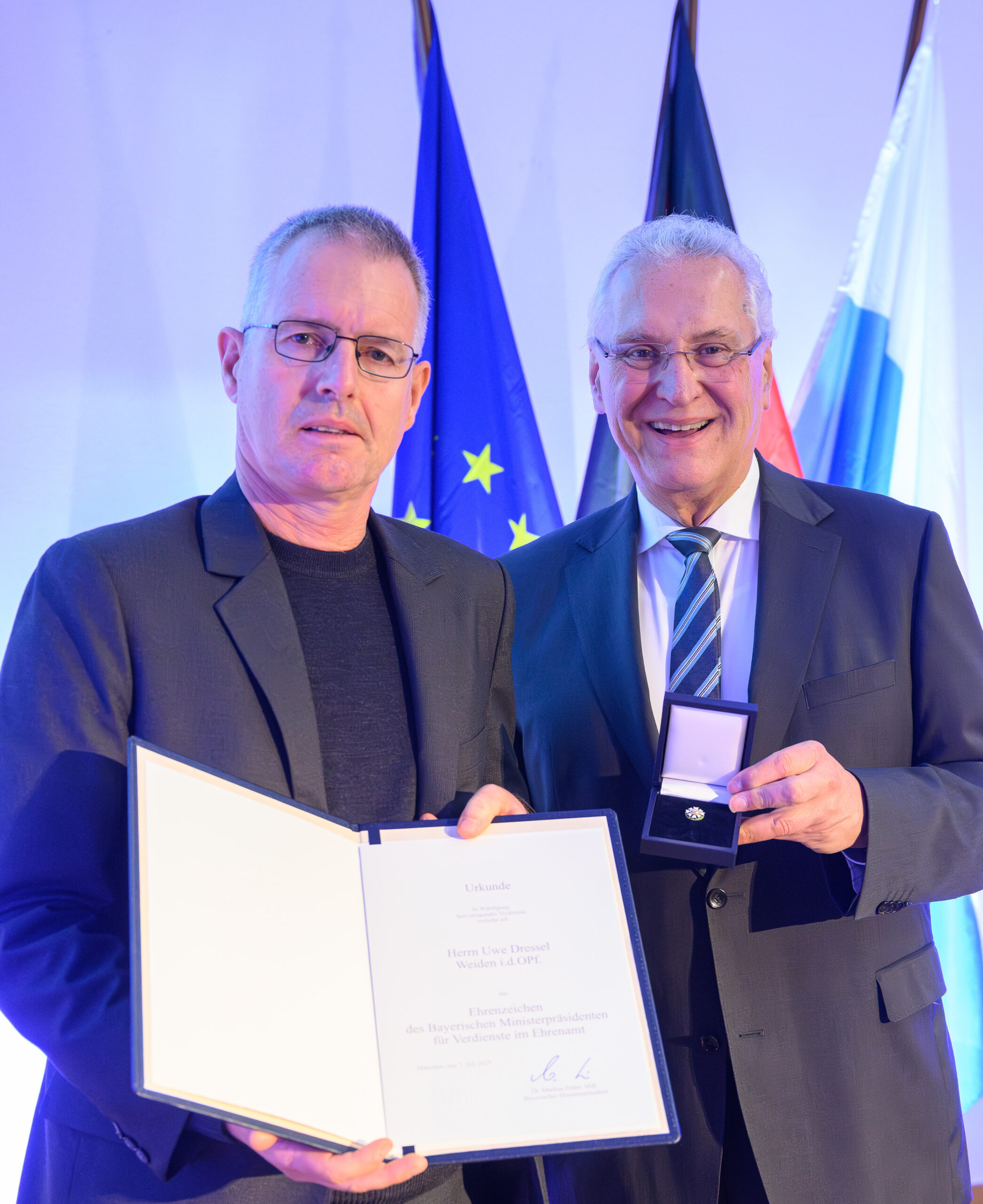 Am 31. Oktober erhielt Uwe Dressel bei einem Festakt in Nürnberg das Ehrenzeichen des Bayerischen Ministerpräsidenten für „langjährige hervorragende ehrenamtliche Tätigkeit“ auf Vorschlag des Weidener Oberbürgermeisters Jens Meyer.